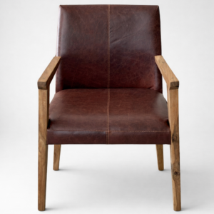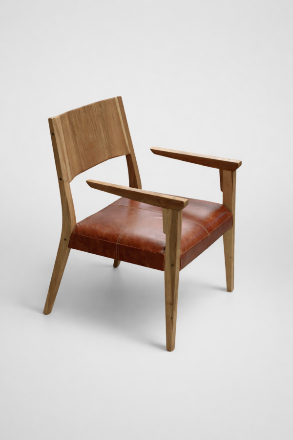 Su estructura en madera nativa y el asiento tapizado en cuero vacuno legítimo lo convierten en una pieza sólida, pensada para acompañar largas sobremesas.